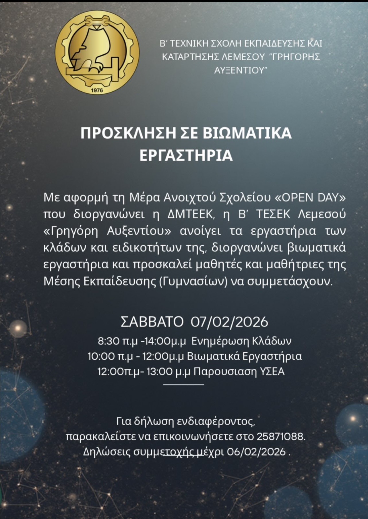 | 04/02/2026 | OPEN DAY Β' Τεχνική Σχολή Λεμεσού | Ενημερωτικό Έντυπο |